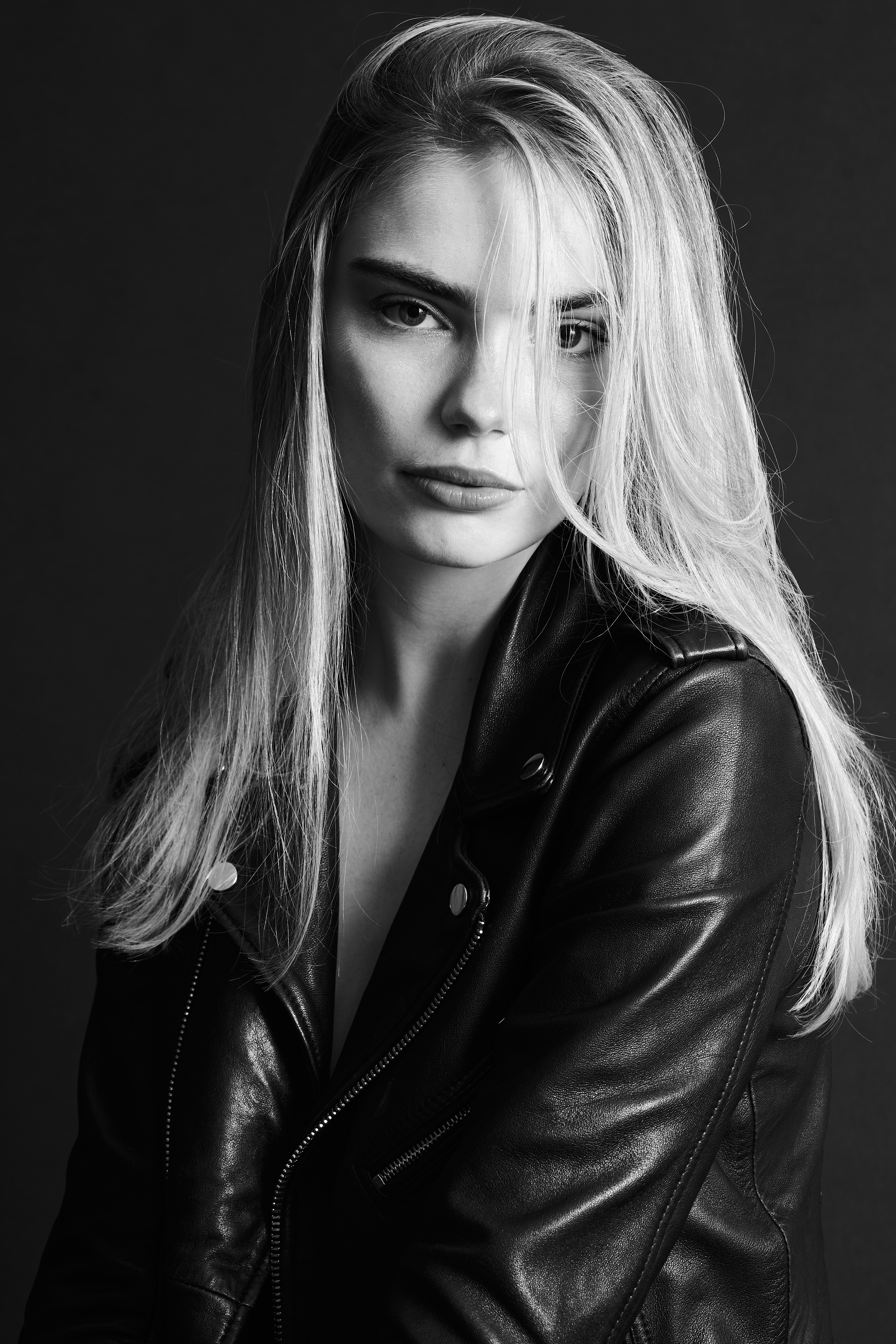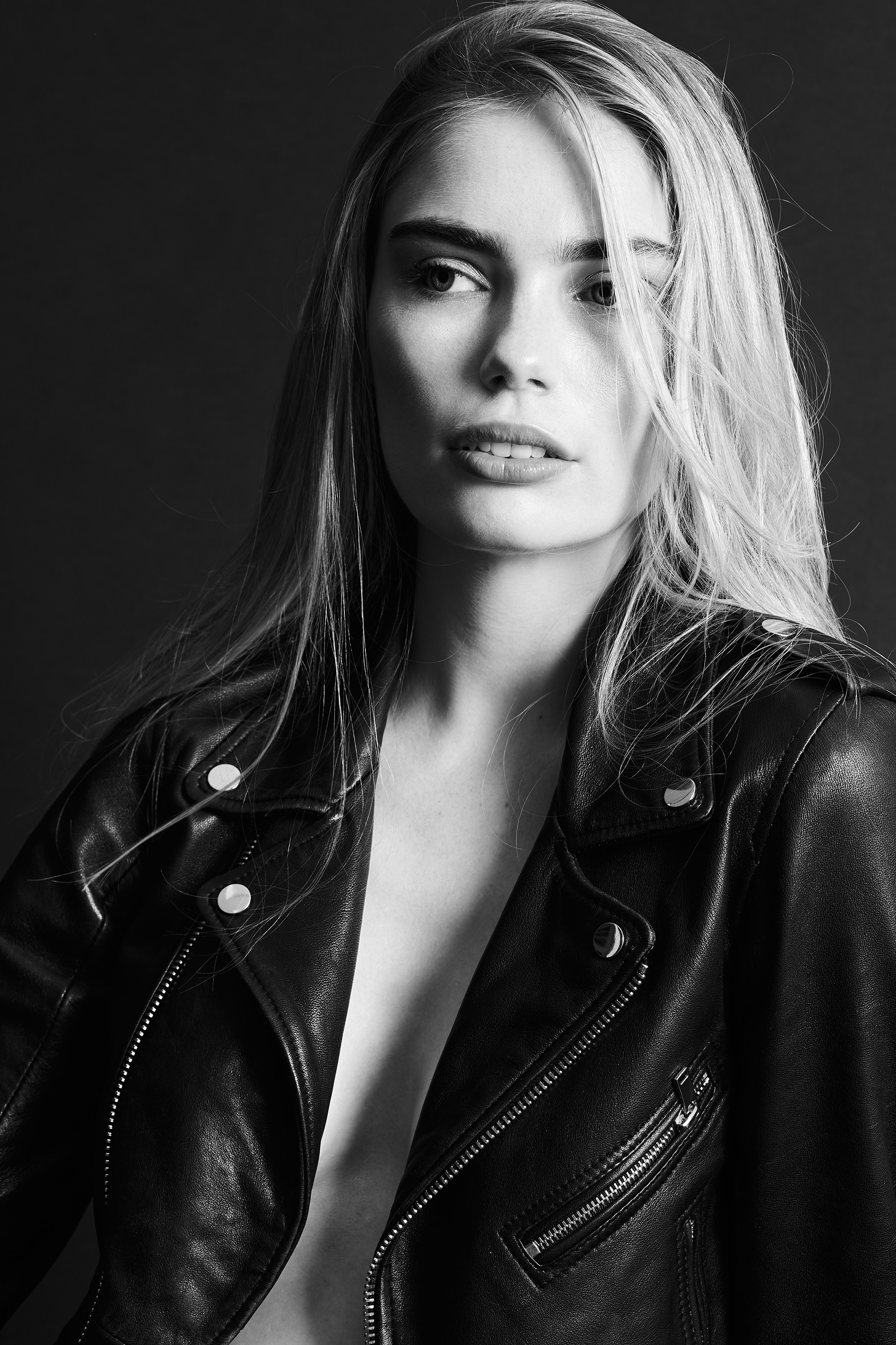 Miss Netherlands Finalist Marlies Smedinga in some black and white shots wearing a leather jacket.